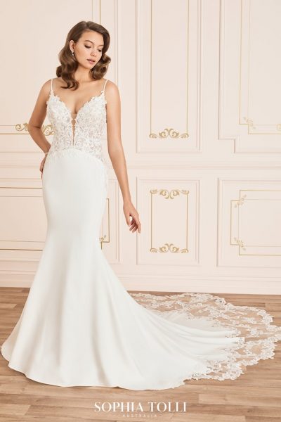 Description: For the modern bride with a bit of a softer side—we have just the thing. Allow us to introduce Style 7078, the perfect blend of chic, modern style with a subtle hint of sexy and all of the romance! The gorgeous V-neckline narrows toward the center to flatter the figure, while the clean curve along the plunge and wide straps feature soft beadwork for a beautiful shine. Mirrored by a defined, open V-back and V-side cutouts, you won’t believe your eyes when you see your figure come to life in this silhouette. The V-back is framed by sheer paneling and organic-inspired lace appliques creating a tattoo-lace illusion. Not quite a fit-and-flare yet not quite a sheath silhouette, the supple crepe fabric flows over the body effortlessly for an updated yet casual feel. Finally, this gown is finished with soft shimmer elements and floral lace appliques over the crepe fabric—creating a unique, multidimensional look you’ll simply have to see in person to believe! Fabrics: Lace on Crepe Detail Options: Ivory Beading White Beading Fabric Colors Available: Ivory Gown with Ivory Tulle Plunge Ivory Gown with Porcelain Tulle Plunge Ivory Gown with Java Tulle Plunge White Gown with White Tulle Plunge White Gown with Porcelain Tulle Plunge White Gown with Java Tulle Plunge Back: Zip Up Only – Fabric Buttons