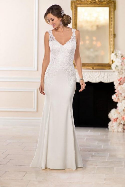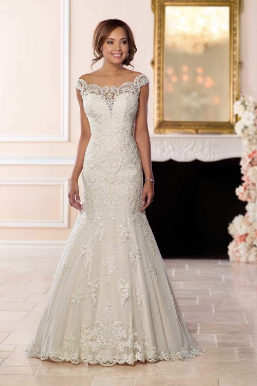 Subtly sexy but totally incredible, this long-sleeved wedding dress with long train is truly one-of-a-kind. For the bride who wants a little bit of everything, this dress combines lace and crepe for a very sleek and chic silhouette. Full lace long sleeves embrace a high neckline and skinny plunge keyhole neckline, while the back of this dress is completely open. Laser-cut lace mixes with matte cotton lace for a truly couture-inspired feeling. The sheer organza bodice feel modern and sexy, while the soft sparkle throughout keeps things fresh. For a final stunning moment, this dress’s scallop train is noteworthy. The crepe skirt mirrors the hand-cut scallop lace edge of the train, making it truly unforgettable.