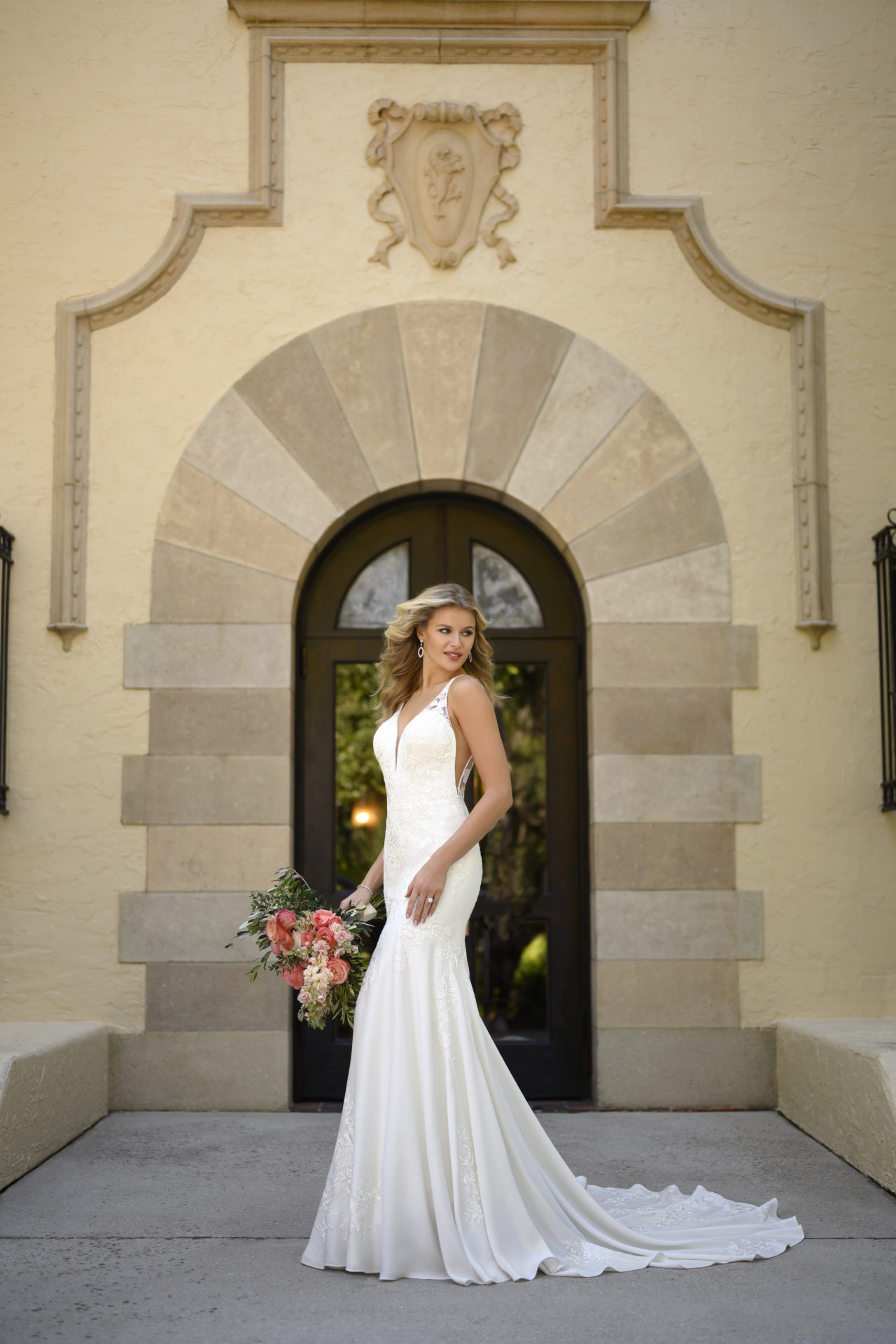 For the modern bride with a bit of a softer side—we have just the thing. Allow us to introduce Style 7078, the perfect blend of chic, modern style with a subtle hint of sexy and all of the romance! The gorgeous V-neckline narrows toward the center to flatter the figure, while the clean curve along the plunge and wide straps feature soft beadwork for a beautiful shine. Mirrored by a defined, open V-back and V-side cutouts, you won’t believe your eyes when you see your figure come to life in this silhouette. The V-back is framed by sheer paneling and organic-inspired lace appliques creating a tattoo-lace illusion. Not quite a fit-and-flare yet not quite a sheath silhouette, the supple crepe fabric flows over the body effortlessly for an updated yet casual feel. Finally, this gown is finished with soft shimmer elements and floral lace appliques over the crepe fabric—creating a unique, multidimensional look you’ll simply have to see in person to believe!